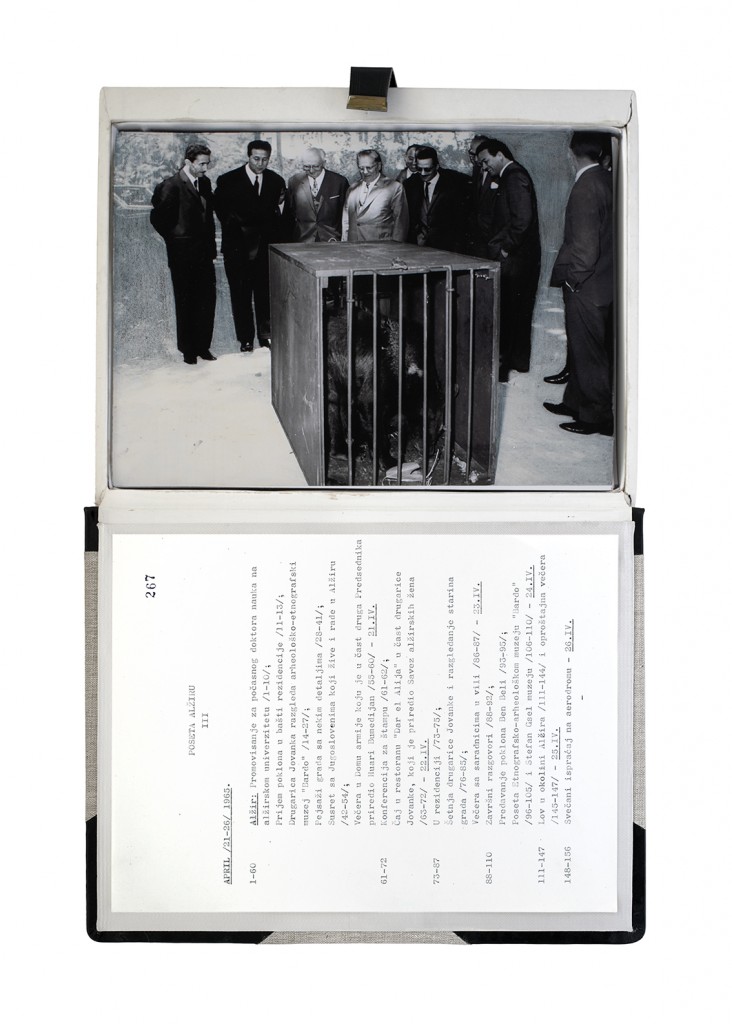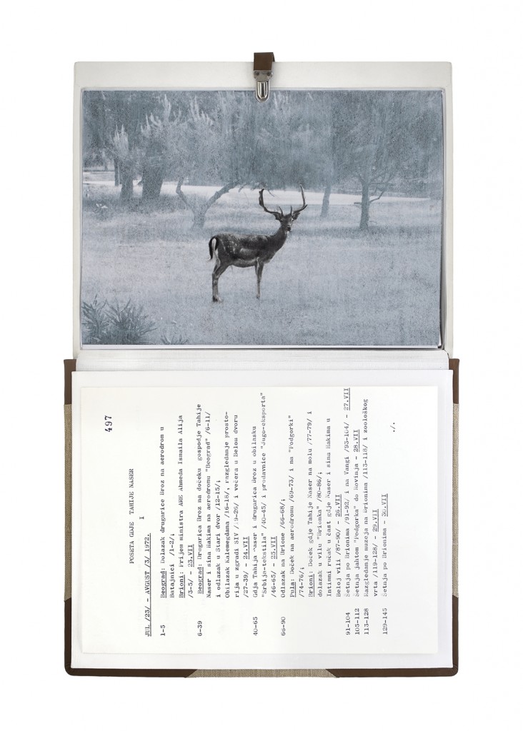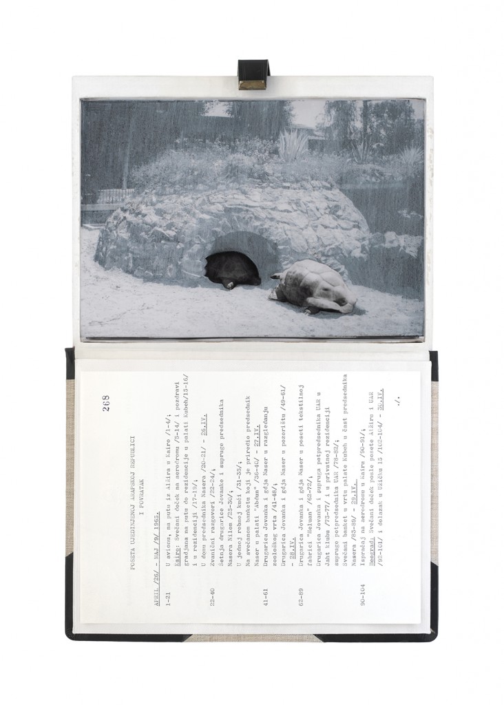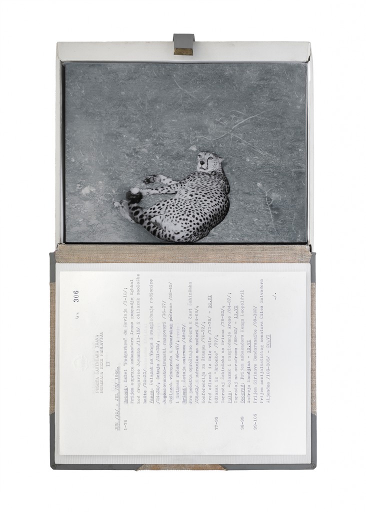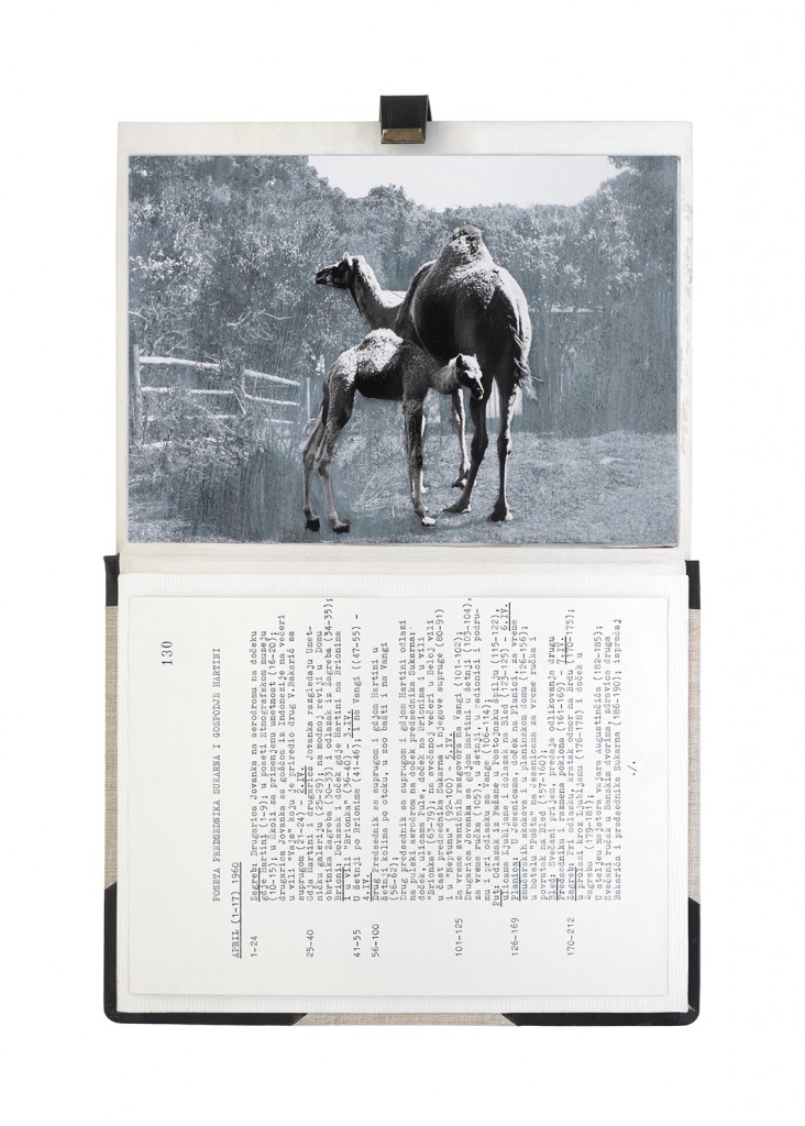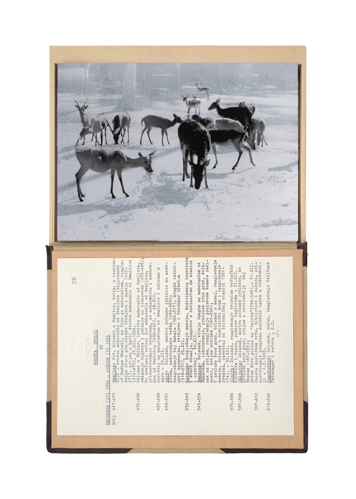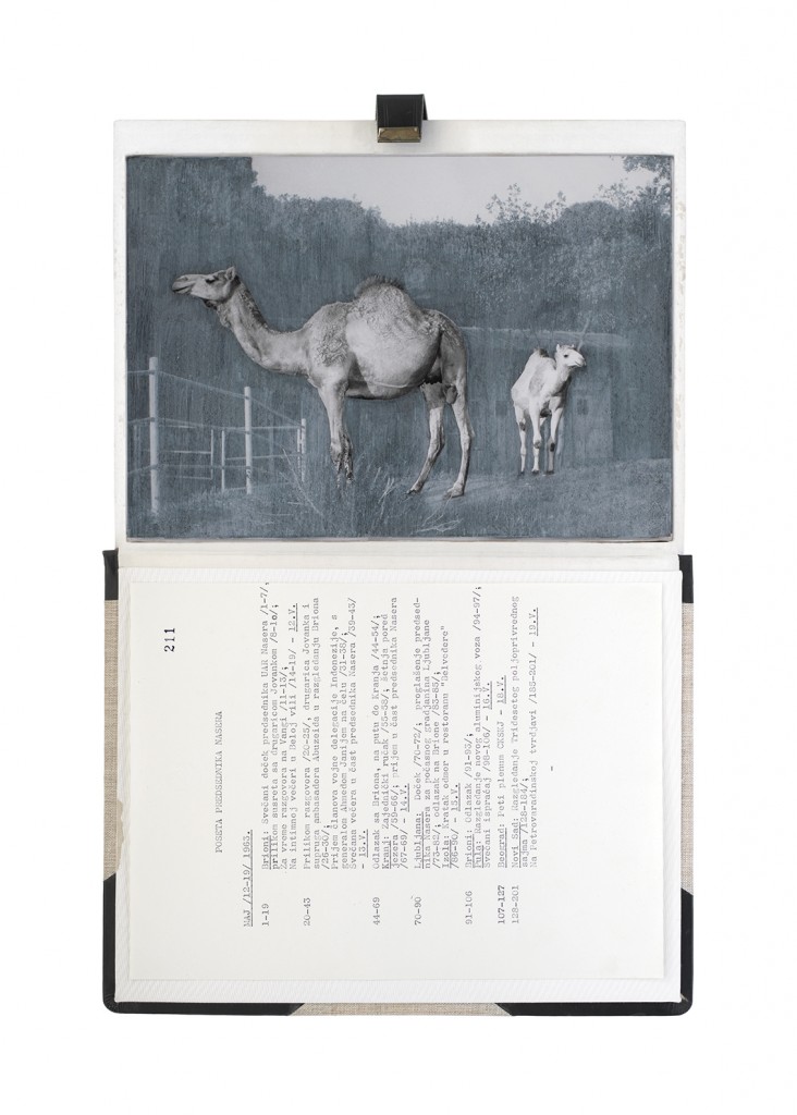 The Gift Ecology presents a series of photographs of Yugoslav government documents detailing the exchange of animals and the ritual functions these gifts performed symbolically in constructing a new transnational political space. Jasmina Cibic erases the geographical context surrounding the events, focusing the viewer’s attention instead on the animals’ portraits and the diplomatic viewership their display once served. As many of the countries—and the multilateral alignments these animals were tasked to represent—begin to fracture or dissolve, the animals’ role as gifts becomes untethered from the obligation of reciprocity. This frees the contemporary viewer to consider their transformed identities, shaped by shifting power structures and silences—perhaps destined to remain forever backstage, within the liberated ruins of colonial and ideological structures.